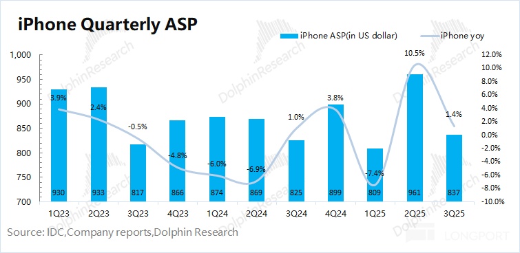 2、iPhone:APPL本季度iPhone 业务实现营收490 亿美元,同比增长6.1%,略低于市场预期(493 亿美元) 。本季度手机业务的增长,受iPhone17 系列新品发布的推动。对于本季度,海豚君估算iPhone 整体出货量同比增长4.6%,出货均价同比上涨1.4% 。