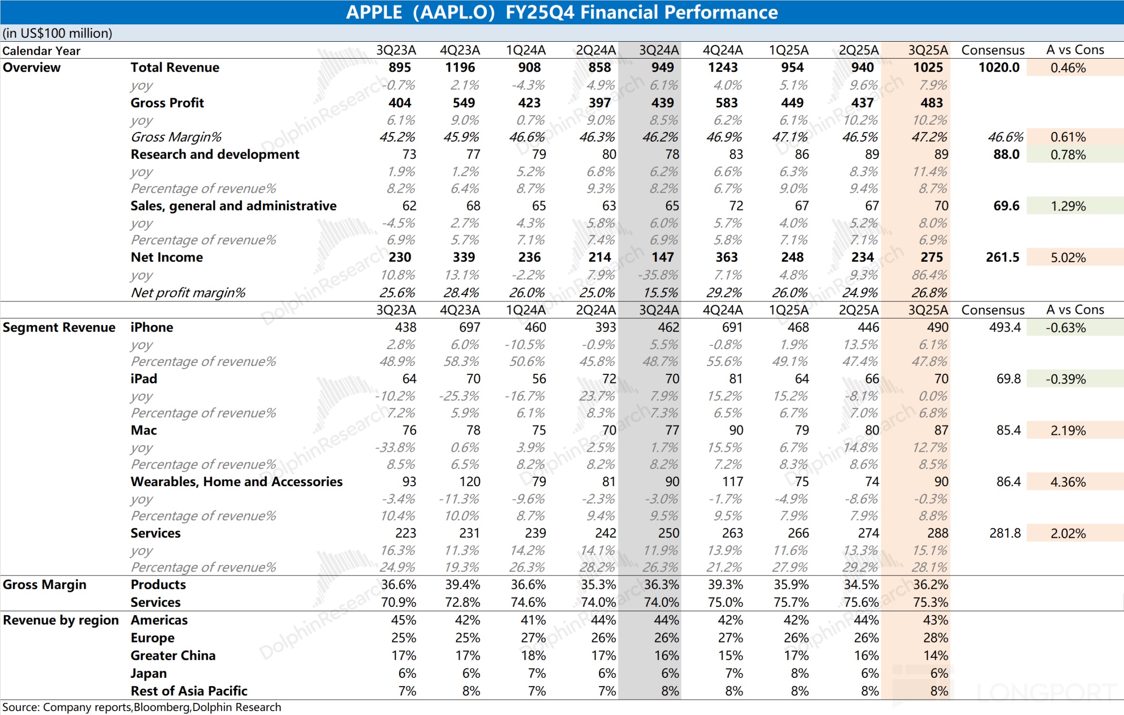 1.1 收入端:2025 财年第四季度(即3Q25)苹果公司实现营收1025 亿美元,同比增长7.9%,符合市场一致预期(1020 亿美元)。公司本季度收入端的提升,主要受益于iPhone、Mac 和软件服务业务增长的带动,而iPad 和可穿戴等其他硬件业务表现仍相对较弱。