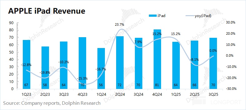 2025 财年第四季度(即3Q25)iPad 业务收入70 亿美元,同比持平,市场一致预期(70 亿美元),由于去年iPad Air/Pro 的发布导致基数较高。