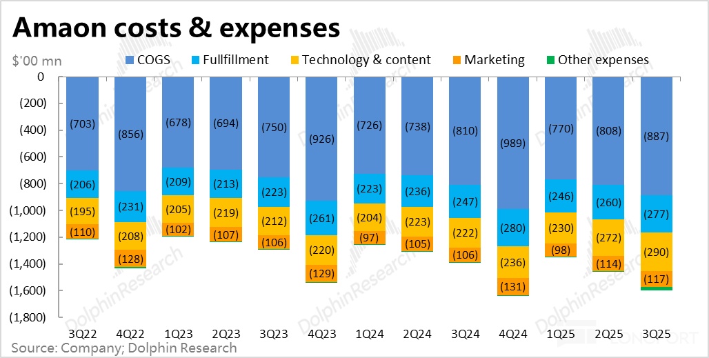 具体来看,履约、销售和管理费用支出的同比增长在6%~12% 之间,仍并不算高。唯独是研发和内容费用一项,同比增长高达30%,增速快速拉升。由于AWS 的员工薪酬、研发成本、部分设备成本,以及流媒体内容的制作成本都记在此费用项目中,可见应当主要还是在云业务上投入的影响。