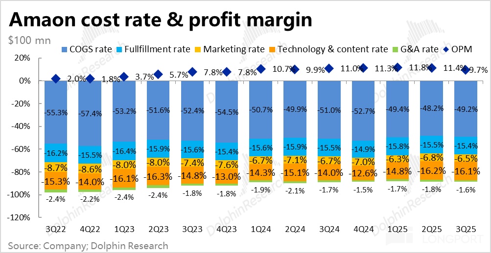 对应的,本季度亚马逊折旧占收入的比重在继续拉高,达到9.3%,后续随着Capex 的进一步增加,折旧的拖累可能更加明显。