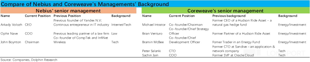 相比之下,据悉公司在新云领域内主要的竞争对手之一— Nebius 则在软件/编程能力上更有优势。作为一个侧面的证据,从两家公司的创始人和核心管理层的不同背景,也能对两家公司不同的导向窥见一二。