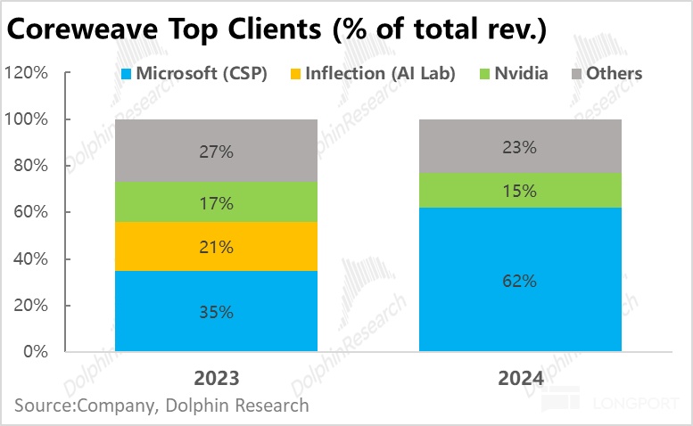 在2024 财年CoreWeave 约$19 亿的总营收中,接近80% 的收入只来自两家客户公司-- 微软和英伟达,其中微软一家就占了当年总收入的62%。