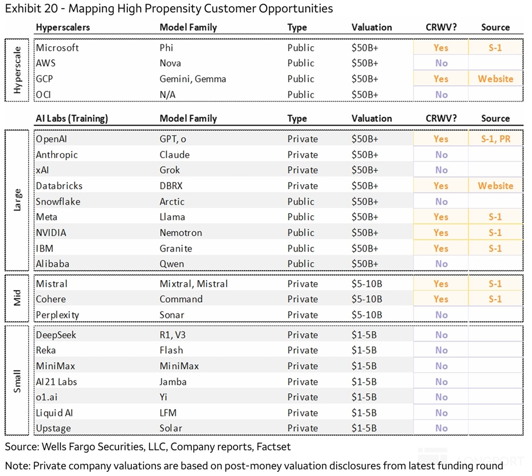 此外,CoreWeave 与Google(最终需求也是OpenAI),以和Databrick,IBM,Cohere,Poolside 等科技公司据报道也有合作。