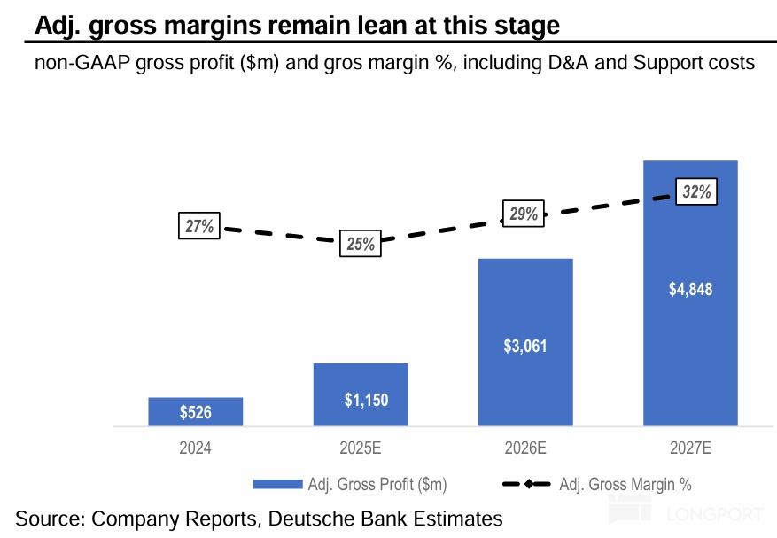 那么从结果来看,市场共识认为CoreWeave 的真实毛利率只在25%~30% 左右,较微软智慧云板块60% 以上的毛利率明显偏低。也正是CoreWeave 在产业链中议价能力不强的体现。
