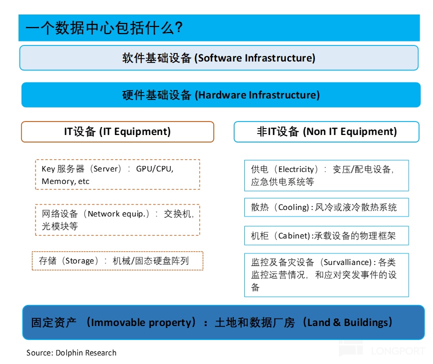 2) 第二层--IT 类设备:在土地&库房的基础上,支撑起一个数据中心的第二层是各类的硬件设备,首先是与提供算力直接相关的各类IT 设备,包括: