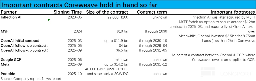 更“实时反映现状” 的在手合约月同样呈现用户集中的现状:在3Q25 披露的$556 亿未履约合同余额中,来自OpenAI,微软和Meta 这三家的合约金额就接近$470 亿。