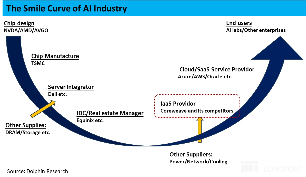 下图概括性的展示了整个云服务从上游到下游的产业链,如著名的“微笑曲线” ,海豚君认为在算力产业链中的两端-- 更靠上游设计和更靠下游接触终端用户的部分是产业链中议价能力相对更强的。