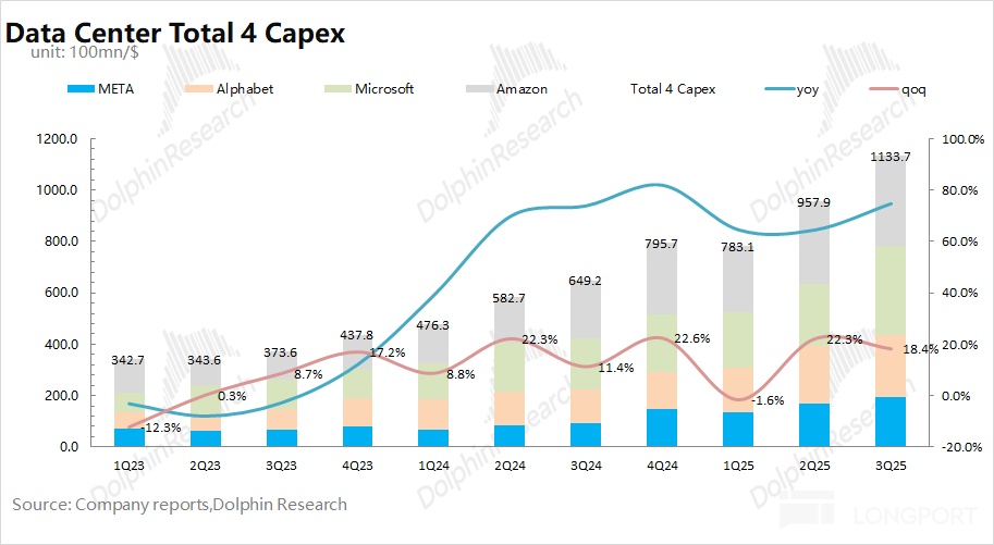 当前云服务厂商依然是公司AI 芯片的最大购买方,因而下游云厂商的资本投入构成了公司数据中心业务增长的基础。而通过四家公司(谷歌、Meta、微软和亚马逊)的管理层交流,海豚君预期四大厂商在2026 年的资本开支有望达到将近5900 亿美元,同比增长42% ,这也为公司明年业绩高增长带来了保障。