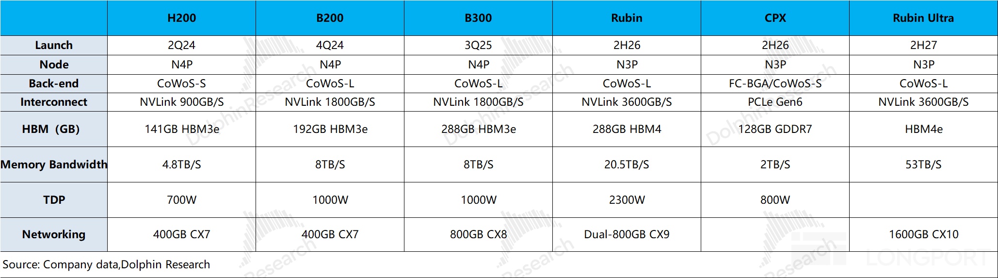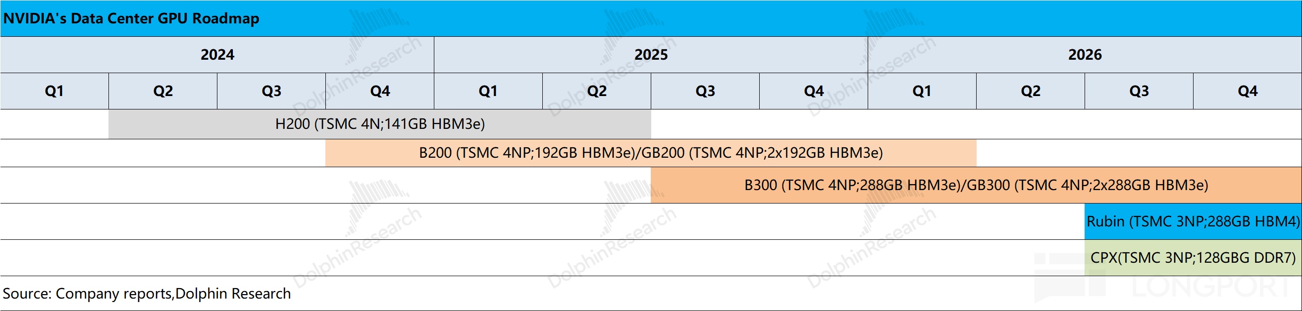 英伟达计划在2026 年下半年推出Rubin 和CPX 产品,届时将开始采用台积电3nm 工艺,在2027 年将继续推出Rubin Ultra 产品。同时值得关注本次财报后,公司管理层给出的新产品进展信息。