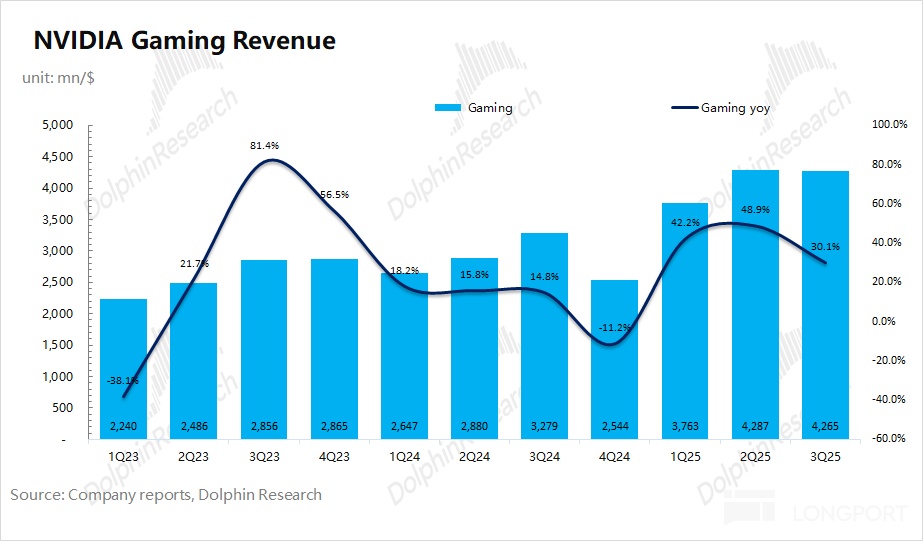 3.游戏业务:本季度收入42.6 亿美元,同比增长30%,受益于下游对公司RTX50 等产品的需求推动。相比于AMD 单季约13 亿美元的收入,英伟达在游戏显卡市场仍具有明显优势。