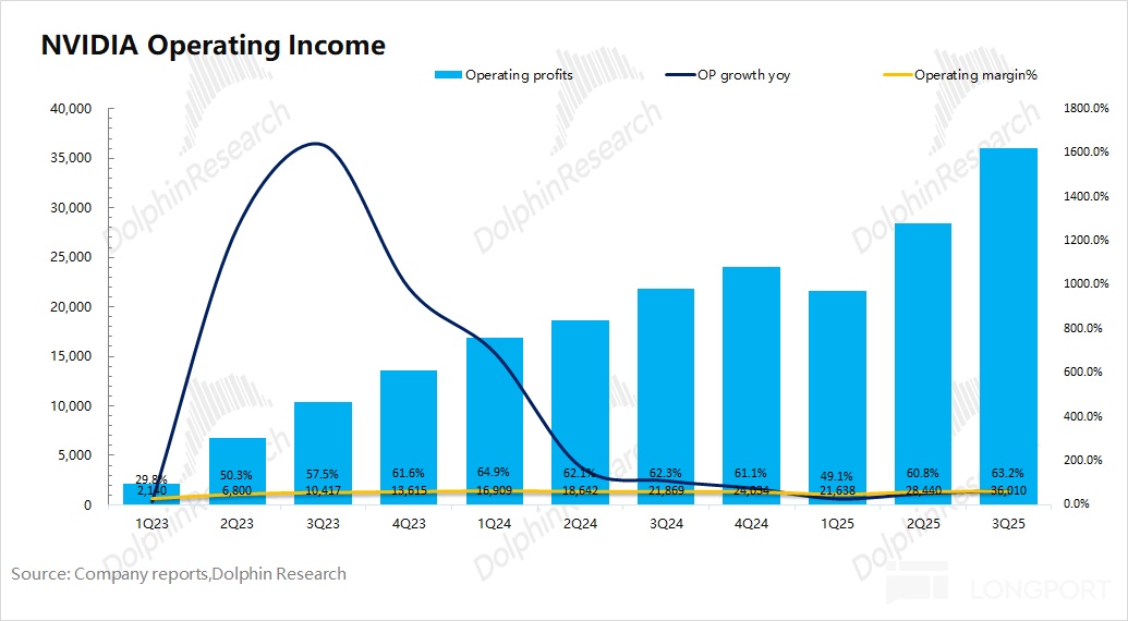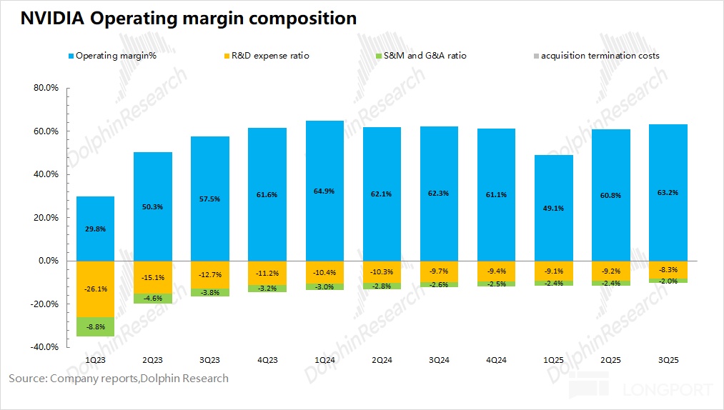 2026 财年第三季度英伟达核心经营利润率为63.2%,继续提升,主要是受毛利率回升以及经营费用率下降的影响。