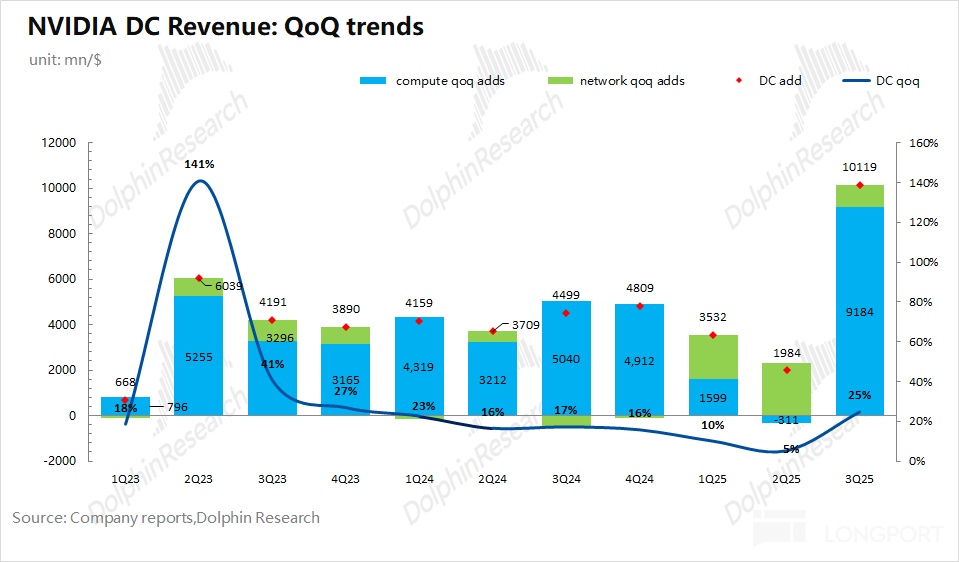 具体来看: ①计算业务收入本季度为430 亿美元,环比增加92 亿美元,其中B300 在本季度的加速量产贡献了最主要的增量; ②网络业务收入本季度为82 亿美元,环比增长9 亿美元。