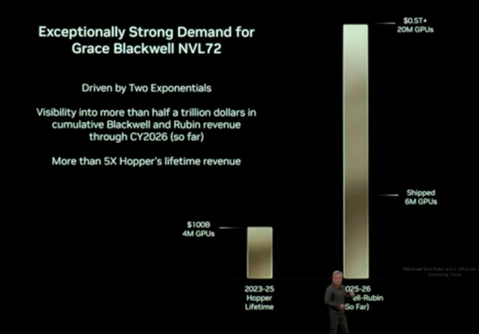 由于公司曾在此前的GTC 大会上披露了AI 业务的展望,预计Blackwell+Rubin 至2026 年底累计达到2000 万颗的出货指引(大致对应5000 亿美元的收入) 。更像是5000 亿收入的季度性节奏分布,当然更快入账会带动短期市场情绪,但同时还要关注市场当下的长期担忧。