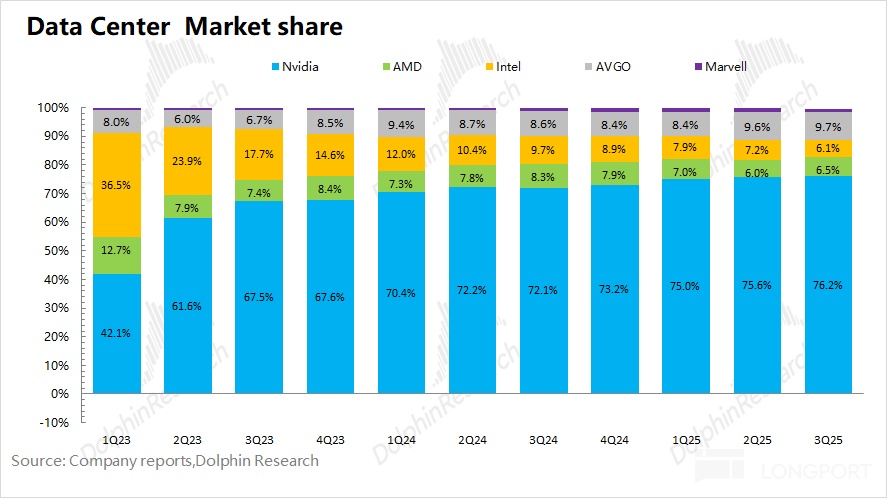 另一方面,当前AI 芯片市场的核心玩家是英伟达、博通和AMD,这三家基本占据了市场90% 以上的份额。英伟达在当前市场中仍处于绝对龙头地位,但博通和AMD 凭借价格优势仍在持续追赶。