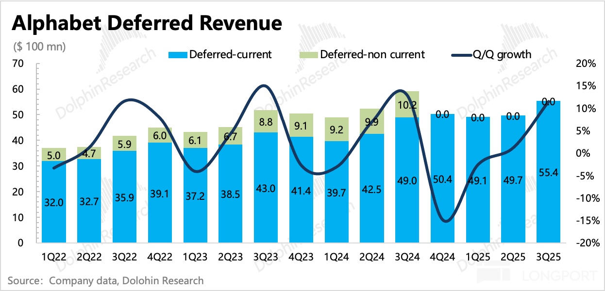 2. 谷歌雲景氣度爆棚:雲業務現在已經主要看積存的未履約訂單了(Revenue Backlog),只要訂單積累保持高增速,那麼未來一段時間的雲收入增長就能夠保持。截至 Q3 末,積存訂單達到 1550 億,同比暴增 79%,環比淨增 470 億,不包含最近剛爆出的 Anthropic 的 200 億訂單。有了這些訂單存貨,收入增速可以在一段時間繼續保持在 30% 以上。