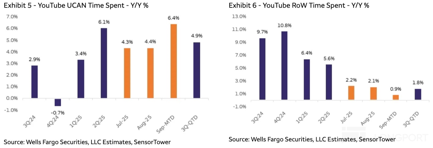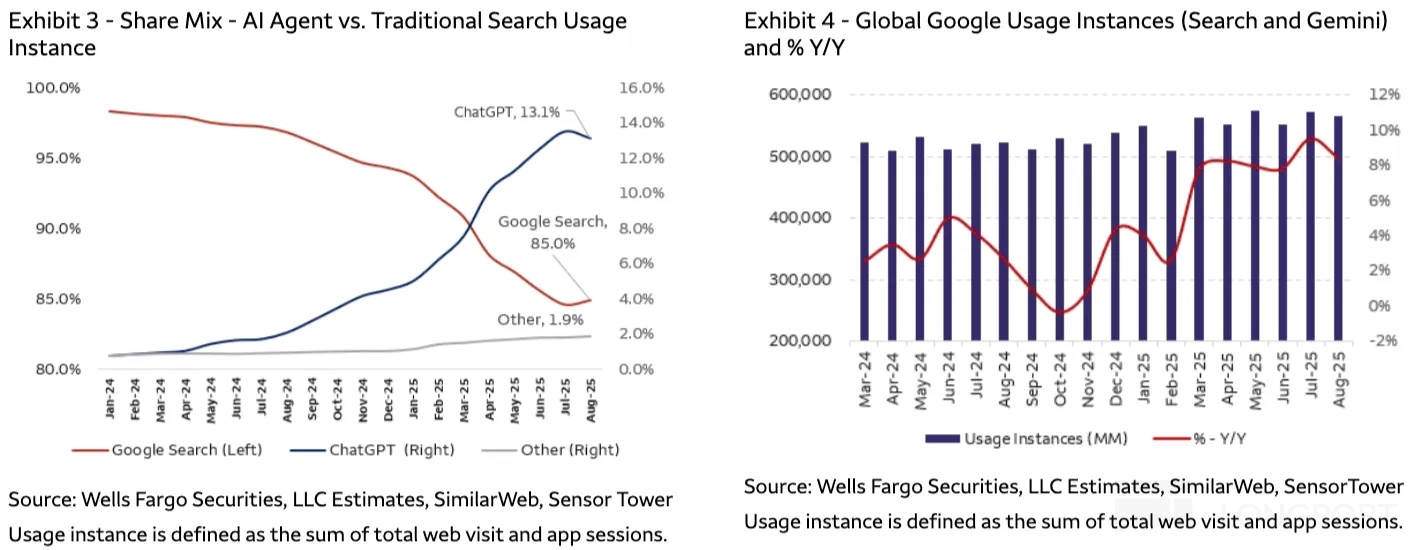 (2)意外的是搜索,不僅沒有在高基數上放緩,並且還更快加速,這就更談不上是否有 AI 侵蝕的問題了。從調研來看,增長驅動主要來自於AI Overviews、AI Mode 對搜索查詢量的提升,從而帶動展示量的增加。