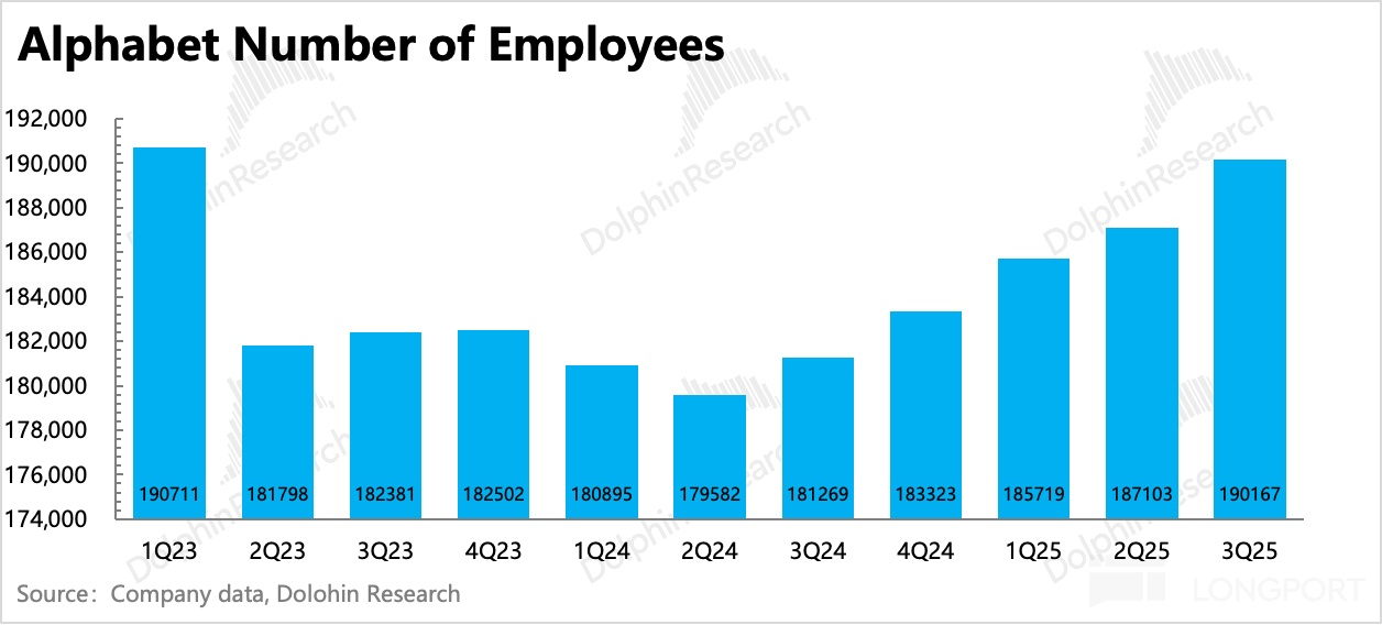 不過盈利能力優化,主要靠的是收入端的擴張。實際支出的絕對值上,還是增長的。其中銷售費用負增長,管理費用剔除罰款也是同比持平,主要新增就是來自研發費用。三季度集團員工規模淨新增了 3064 人,但後續大廠對傳統業務優化裁員還是主要方向。年初谷歌就頒佈了自願離職方案,後續應該還是保持進出穩態區間(優化傳統業務,新增 AI 等新業務),而非趨勢性的擴張。