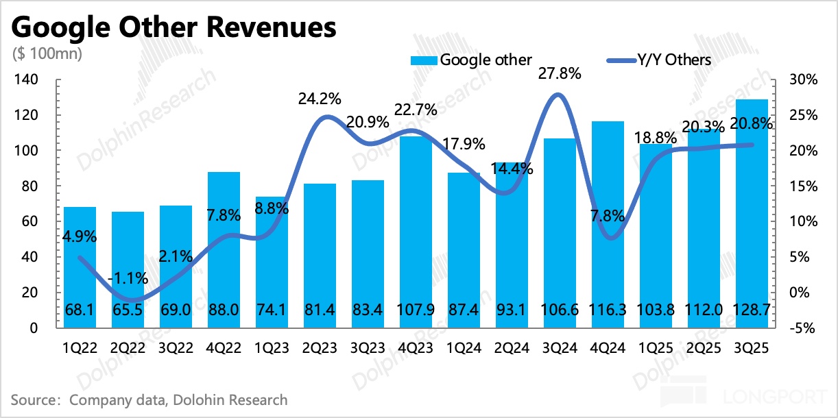 這部分收入主要由 YouTube 訂閲(TV、音樂等)、Google Play、Google、One、硬件(手機 Pixel 和智能家電 Nest)等組成。