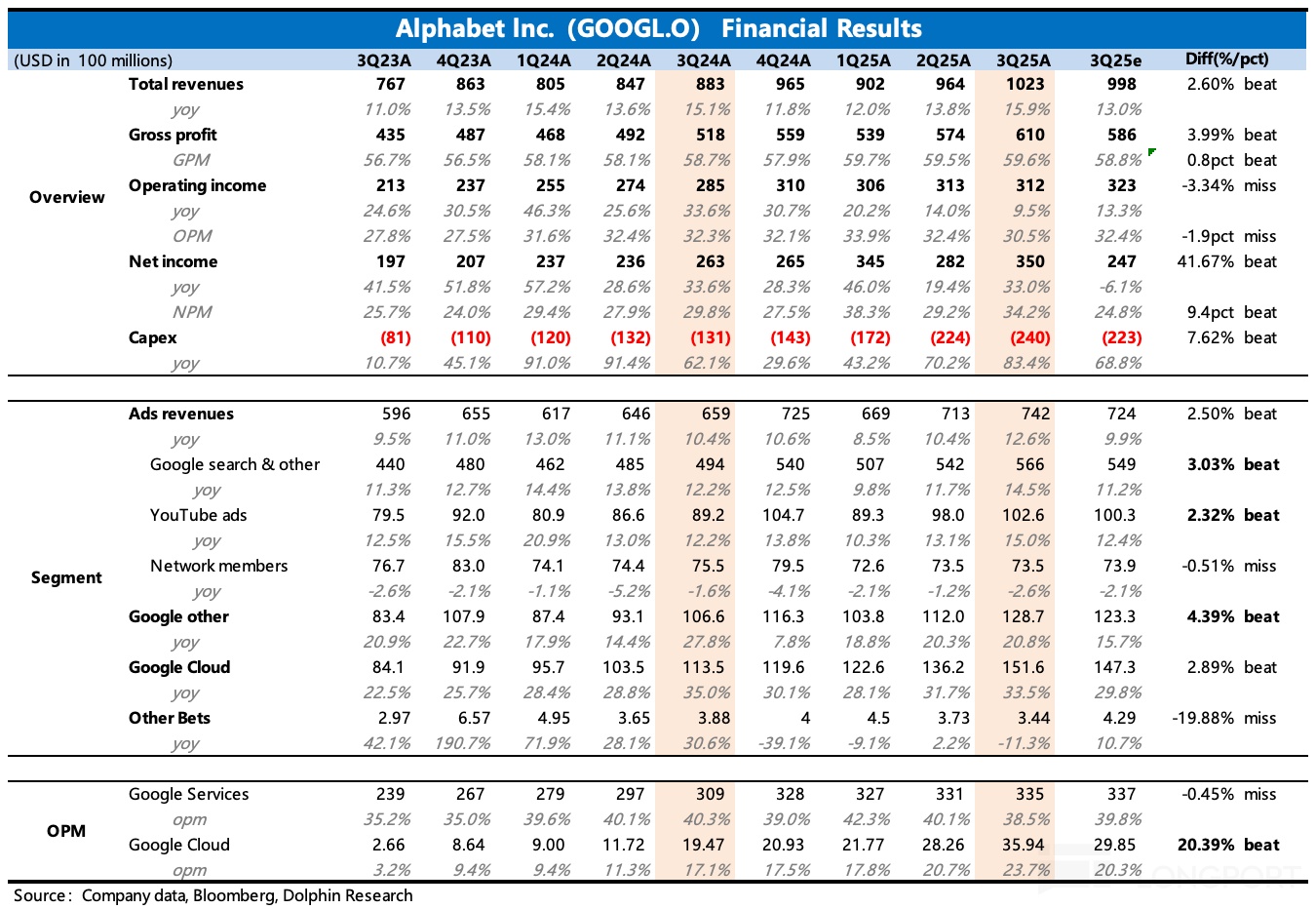 - 谷歌 2025 年三季度財報顯示整體營收 1023 億,同比增長 15.9%。