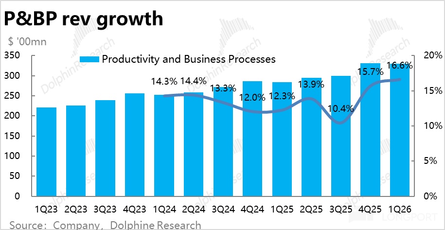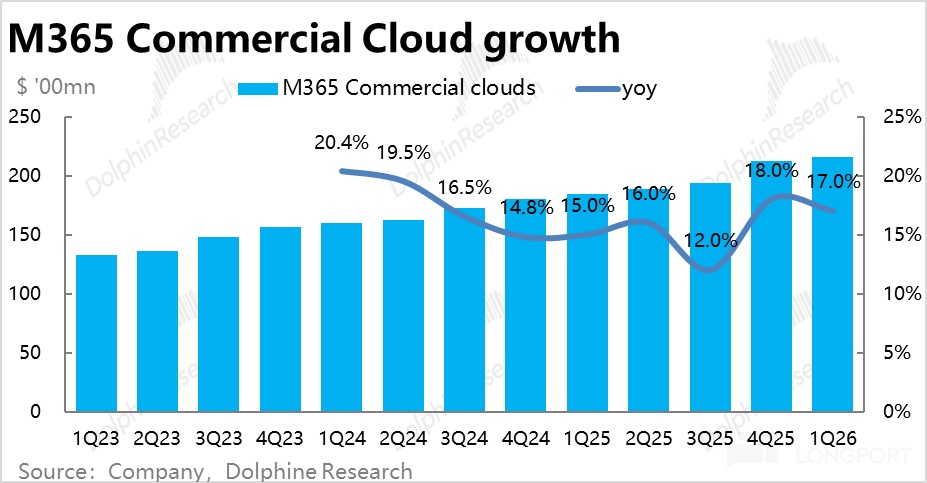 整體上,雖然核心商用 M365 業務增長平穩中略降,但在消費 M365 強勁提速增長的拉動下,本季生產力流程板塊的整體的營收增速為 16.6%,較上季小幅提速,且同樣小超彭博預期 2.3%。