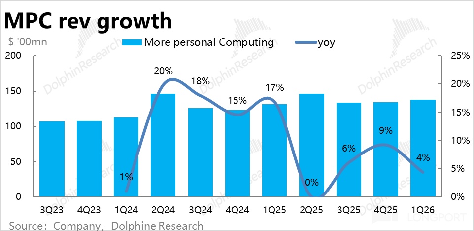 在完全渡過了並表動視暴雪的影響期後,更多個人計算板塊的增長開始迴歸常態。本季度營收增長 4%,沒有公司先前指引的會負增長那麼差。但維持在低個位數的增速,意味着仍沒有值得特別關注之處。