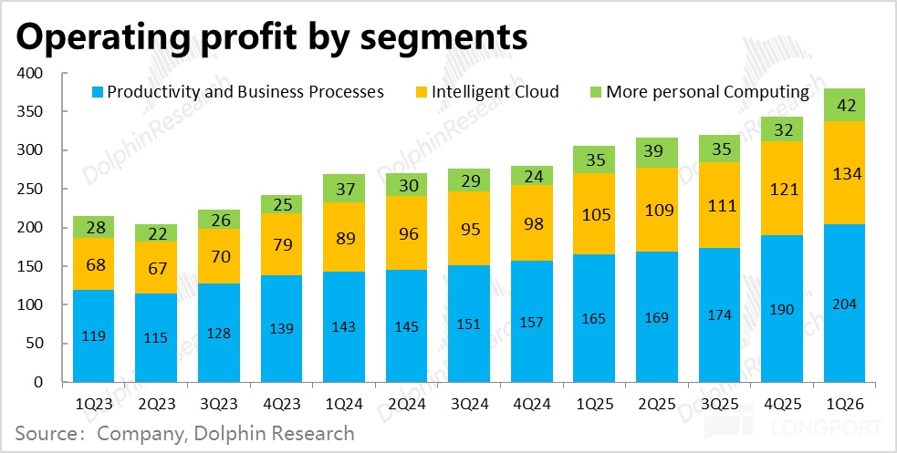 利潤表現則更出色,提效和控費對沖了折舊導致的毛利率下滑,本季度微軟整體經營利潤率整整同比走高了 2.3pct。最終經營利潤$380 億,同比增長了 24%,大幅跑贏營收增速。