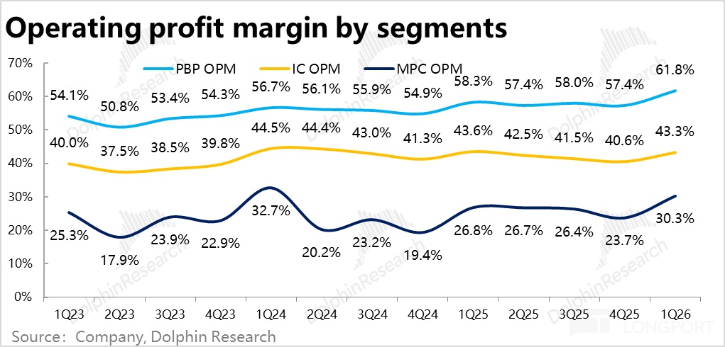 4)分板塊來看,本季各個板塊的利潤率全面環比走高。其中承擔了最多 Capex 和折舊的智慧雲板塊也靠着優秀的控費,經營利潤率環比提升了 2.7pct。而因提價和業績觸底的生產力與個人計算板塊,在毛利率上就是同比提升的,再疊加優秀的控費,經營利潤率提升的幅度就更高了。