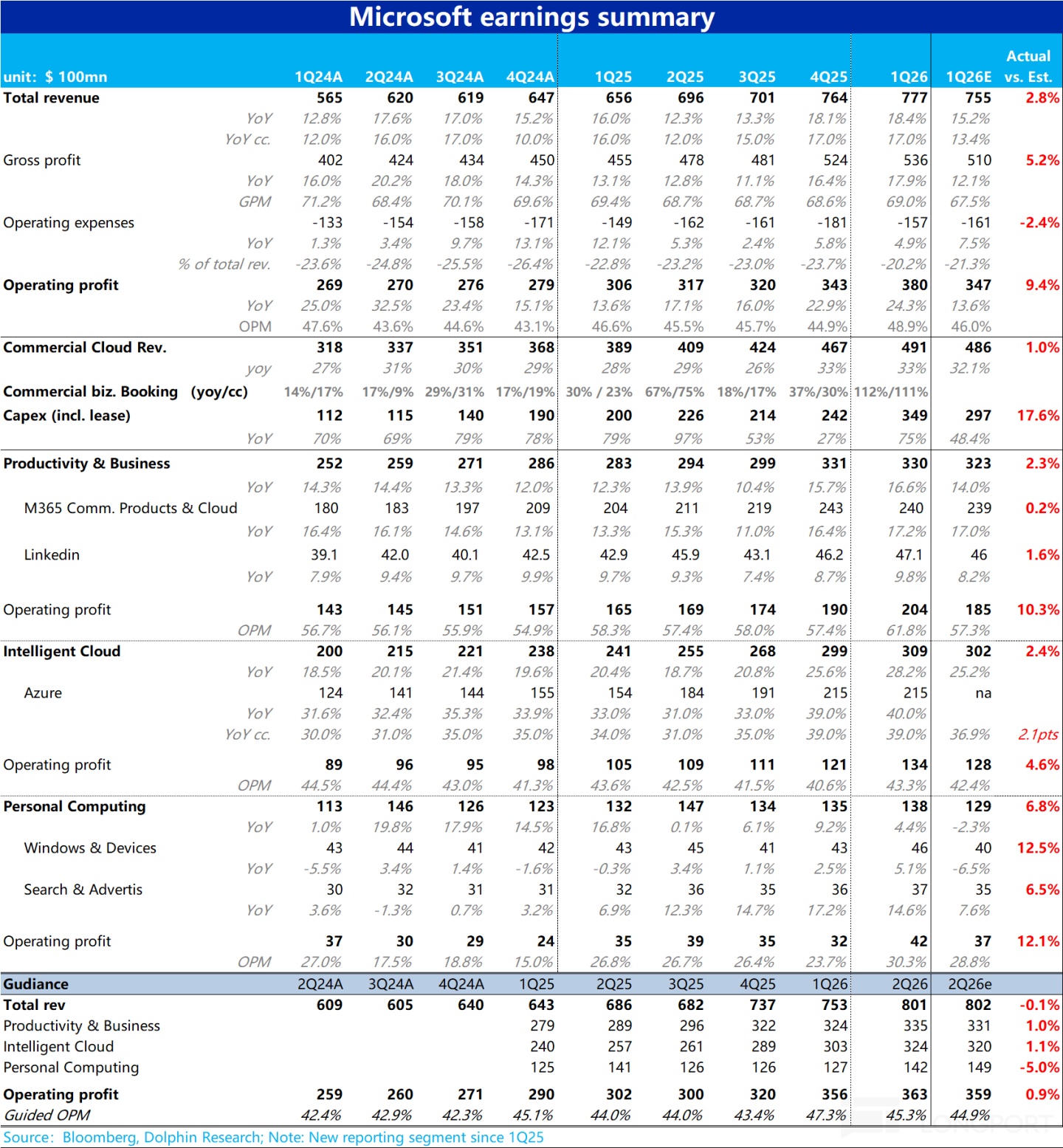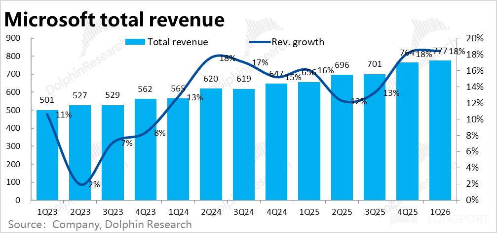 匯總上述各板塊表現,微軟集團整體本季度營收$777 億,同比增長 18%,趨勢上相比上季大體平穩、略微有提速,但相比公司上季給出的指引和彭博一致預期的 15%,是明顯超預期的。