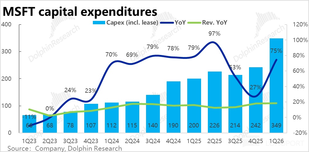 雖然業績前,市場已普遍預期微軟本季的 Capex 支出會再度上調,賣方一致預期放到了 300 億左右。然而實際 Capex(包括租賃)支出達到了 349 億,環比上季度再度拉高超$100 億,再創歷史新高。