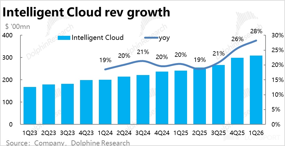 整體上,因 Azure 的增速環比提速 1pct,且 Azure 外服務器產品的收入增速也扭跌轉升,智慧雲板塊本季整體收入$309 億,同比增長 28%,好於市場預期 2.4%。