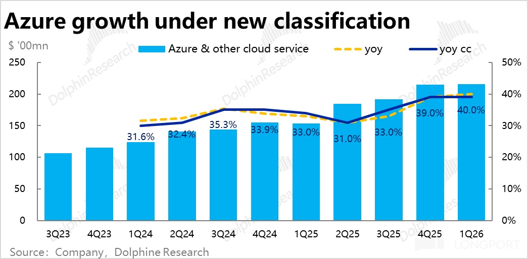 1、Azure 沒有意外之喜:最受關注的 Azure 業務,本季營收同比增長 40%,剔除匯率影響增速則為 39%,不變口徑下和上季增速一致。