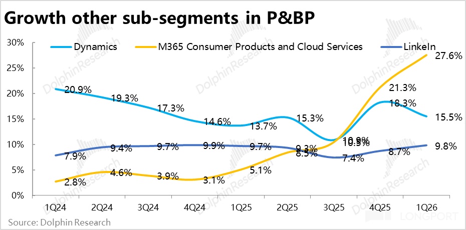 生產力板塊中的其他業務, LinkedIn 的收入增速在低位保持平穩,而 Dynamics 的增長在上季的 “暫時” 高點後也再度回落,沒有特別值得關注之處。