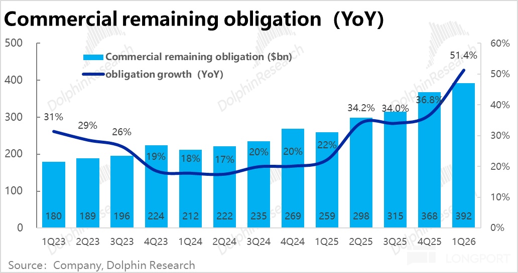因此,待履約企業合同餘額本季增速也拉高到了 51%,達$3920 億,環比上季增多了 240 億。平均合約年限在 2 年左右,換言之,僅考慮目前已有的未履約企業合同,就能確保後續每年近 2000 億的收入。