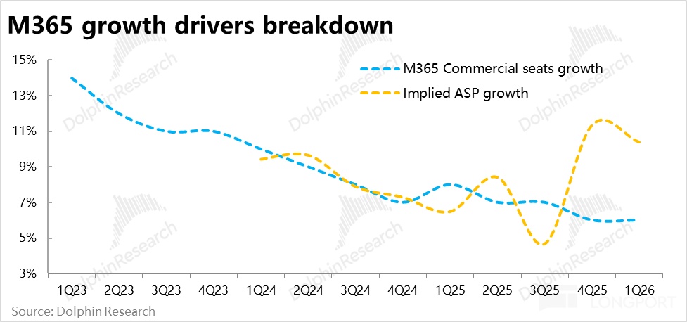 從量價角度來看,1)本季商用 M365 的訂閲坐席數量同比增加了 7%,增速較上季度持平;2)平均客單價的同比漲幅則從上季的 11.3% 收窄到 10.4%。