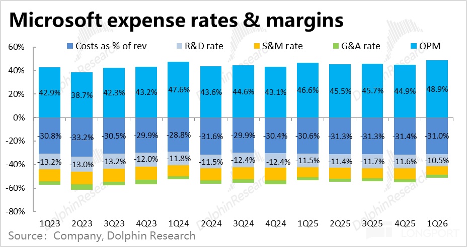 本季微軟的毛利率為 69%,雖然確實同比下降了 0.4pct,但比彭博預期高出了整整 1.5pct。同時,經營三費合計同比增長僅 4.9%,相比上季的 5.8% 繼續收窄,也遠低於營收和毛利潤約 18% 的增速,從而費用率佔收入比重同比來看被攤薄了整整 2pct。