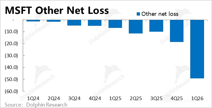 剔除其他損益中來自投資/利息損益的部分,剩下的部分在F1Q24~1Q26 的兩年間,由虧損僅略超 1 億,大幅增長到單季虧損約 49 億。反映了微軟確認 OAI 虧損的快速擴大,對微軟整體淨利潤的拖累也越發明顯。