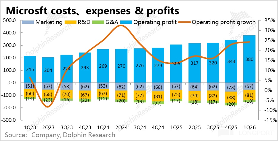 2)費用角度,微軟本季的營銷、研發和管理費用三費合計同比增長僅 4.9%,相比上季的 5.8% 繼續收窄,也遠低於營收和毛利潤約 18% 的增速,因此費用率同比來看被攤薄了 2pct。具體來看,營銷費用零增長是主要功臣,而研發和管理費用則都同比增長了約 8%。