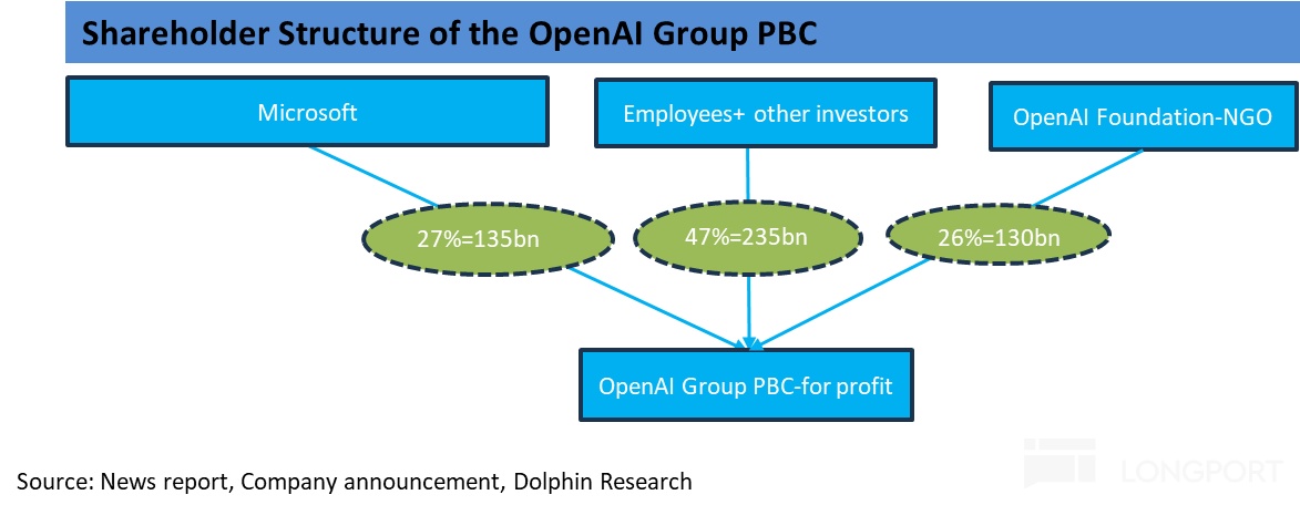 1)在將 OpenAI 的運營主體,由 “有限盈利” 模式轉變為盈利為目的公眾公司後,微軟持有新主體約 27% 的份額。按最新一輪融資 OAI 約$5000 億的估值,即微軟獲得了價值約$1350 億的股份和對 OAI 運營主體 27% 的利潤/虧損歸屬權。意味着,“有限盈利” 模型下,原先微軟能從 OAI 獲得的利潤上限為其投總投資額($140 億以上)8x 的限制解除了。
