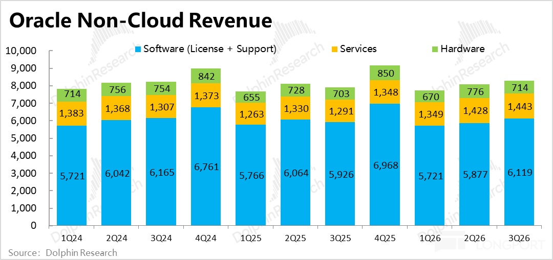 首先大背景是,甲骨文剔除 OCI 業務 -- 即 IaaS 雲業務外,剩下的所有傳統業務都已完全沒有成長性,長期營收增速都只徘徊在零上下、好也不過個位數增長。且在當下,和其他軟件公司一樣,這部分傳統業務也存在被 AI 顛覆的風險。