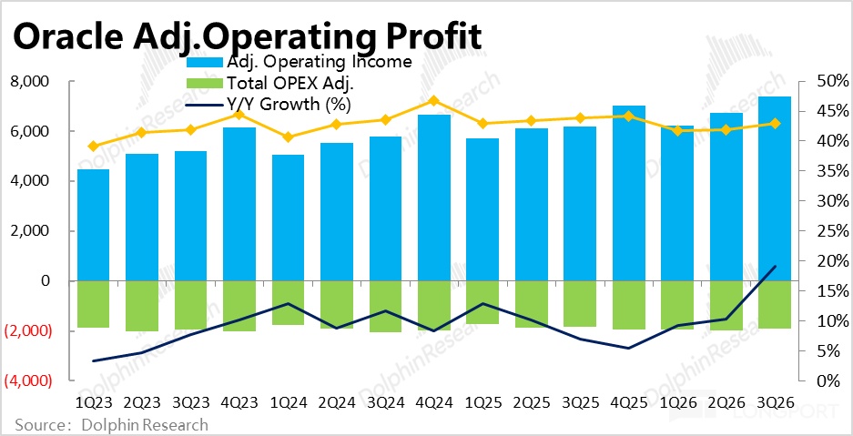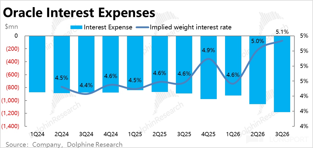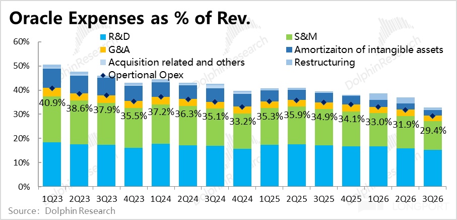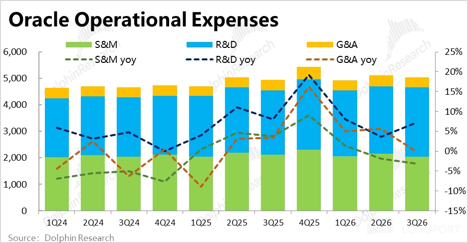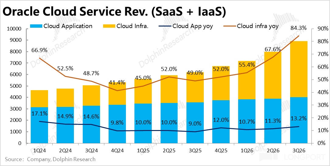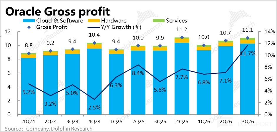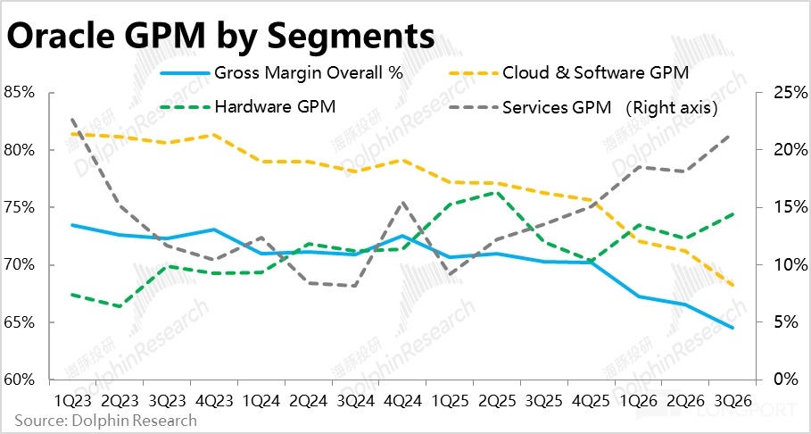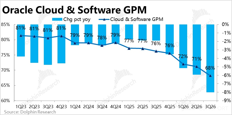 2、AI 業務對毛利率的拖累比預期要嚴重:作為 OCI 加速增長的伴生影響,本季雲 + 軟件業務合計的毛利率(不單獨拆分披露),本季約 68%,同比跌幅達到 8pct,比上季的 5.9pct 進一步擴大,差於市場預期。