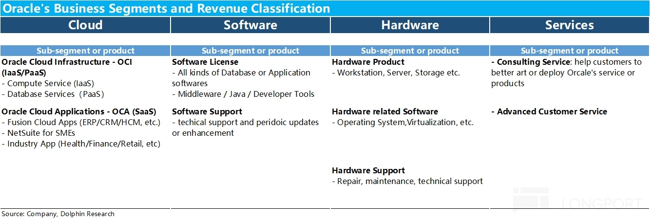 a. 雲業務:可進一步細分為 IaaS 類的 OCI 和 SaaS 類的 OCA 兩條業務線。其中 OCA 主要包括 SaaS 化的 ERP/CRM/ERP 等通用管理工具,和一些垂類行業工具。而OCI 則主要包括公司特色的數據庫服務和算力租賃業務。