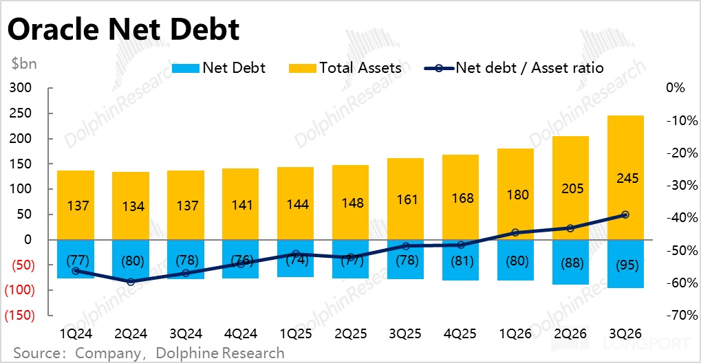 合計以上兩點來看,雖然甲骨文當前股價完全抹去了 Stargate 項目和 3000 億訂單以來的所有漲幅。但按最嚴格的視角,若後續 AI 業務被證偽(無論是 OpenAI 未能履約合同,還是 AI 業務最終的經濟模型沒有跑通,利潤率太低)。並且若 AI 真被證偽,不僅是估值歸零而已,因此產生的高額負債和資產投入會造成量的負資產,因此僅憑傳統業務估值是不能完全支撐當前市值,還可能有不小的回調空間。