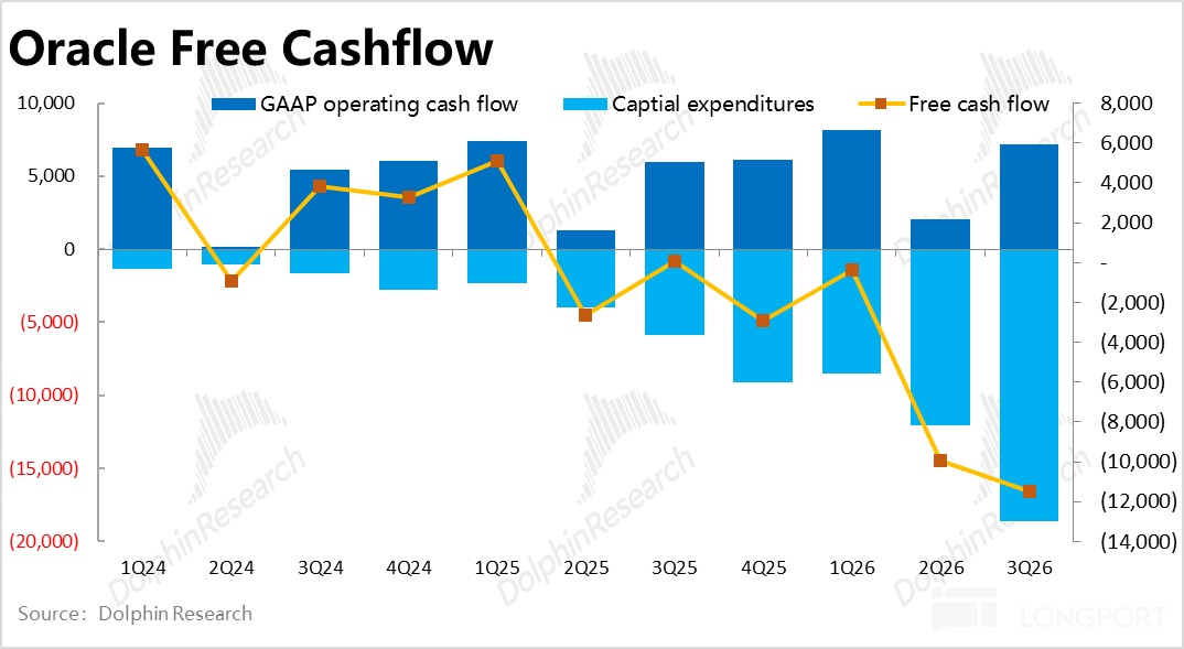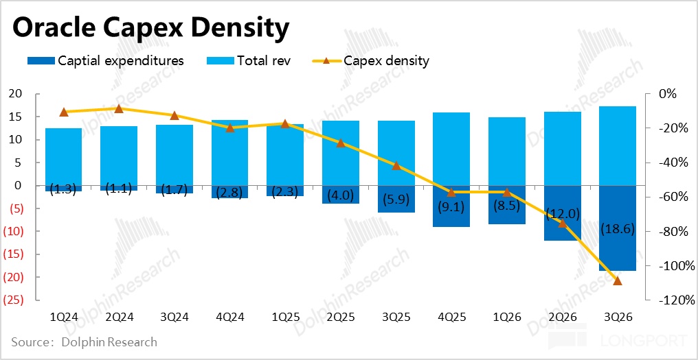 並且本季的 Capex 總額也首次高過了公司本季的總營收額,雖然另一新雲 CoreWeave 的情況類似。但畢竟 Oralce 是個有另一半收入來自傳統業務的老龍頭公司,還是非常罕見的現象。